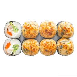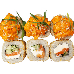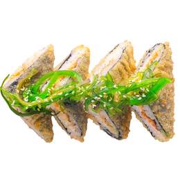 Норвежский лосось, сыр Cremette, японский рис, авокадо и салат чука. Подается жаренным в хрустящей корочке