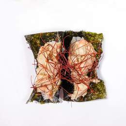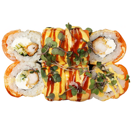 Ролл с опалённым гребешком и спайси соусом, внутри — тамаго, авокадо и огурец. Украшен трюфельным унаги и пикантным васаби соусами, посыпан нитями чили и тичими — огненное сочетание вкуса и стиля.