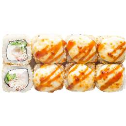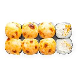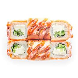 Запеченный ролл с норвежским лососем, сыр cremette, огурец и фирменный соус