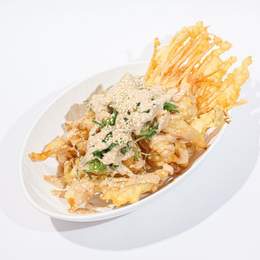 Хрустящие эноки и вешенки в темпуре с салатом чука и ореховым соусом