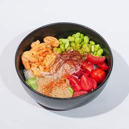 Креветки в спайси соусе, авокадо в соусе гамадари, помидоры черри, эдамаме на подушке из японского риса