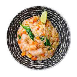 Креветки, том ям паста, кокосовое молоко, грибы шампиньоны, черри, лайм, корень галанга, лемонграсс, лист лайма-каффира, подается с рисом Шинаки