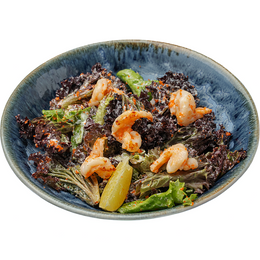 Легкий салат, входят свежий микс салата, оранжевая тобико. Креветки, и обжаренные с маслом и соевым соусом, добавляют насыщенный вкус. Соединяются с соусом и перемешиваются до однородности. Салат подается с долькой лимона, добавляющей свежесть