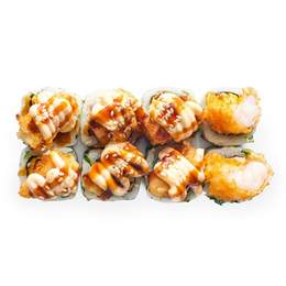 Креветка темпура, тамаго, зеленый лук, фирменный соус и соус терияки