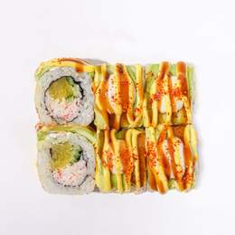 Ролл с нежный краб спайс с хрустящим такуаном и огурцом, авокадо сверху, подается с тремя сладкими соусами: манго, юдзу и унаги.