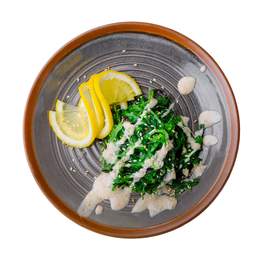 Морские водоросли чука подаются с ореховым соусом, украшается кунжутом и долькой лимона