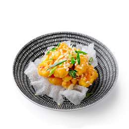 Хрустящий попкорн из креветок с соусом динамит и орехом кешью