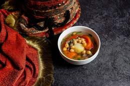 Традиционный суп из ягнёнка с добавлением овощей и гороха нохат.
