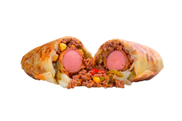 Говяжья сосиска в панировке с добавлением мясного соуса чили кон карне и перчиками халапеньо. Все это обжаривается в тортильи с сыром внутри.