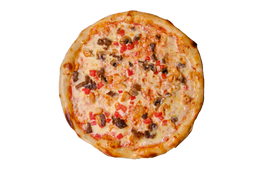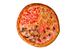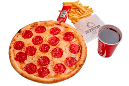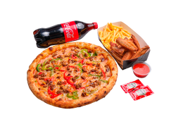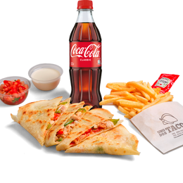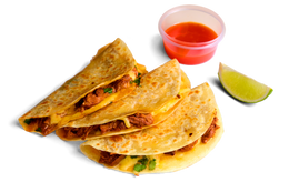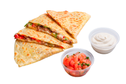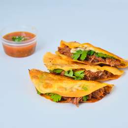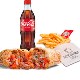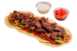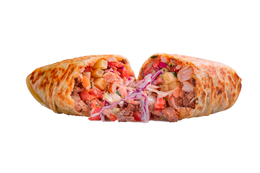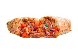 В пшеничную тортилью заворачивается двойная порция мяса - говядина и курица стейк, классическая сальса и сыр. Далее это обжаривается в тортильи на плите