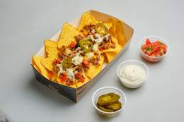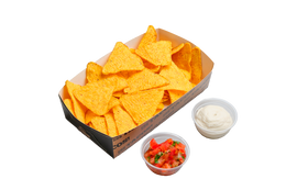Кукурузные чипсы готовятся с чили кон корне и сыром. Подаётся с соусами сальса и сметана
