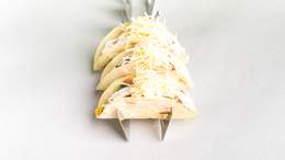 В пшеничную тортилью заворачивается слоями сыр, овощи фахитас, соус "Сальса", ТОФУ, сыр. Обжаривается на плите с двух сторон