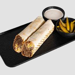 сочный донер с говяжьим мясом, завернутым в лаваш, острые перчики подаются к блюду