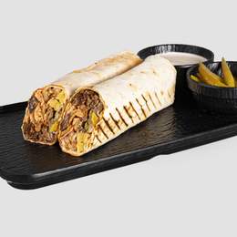 сочный донер с говяжьим и куриным мясом, завернутым в лаваш, острые перчики подаются к блюду
