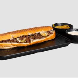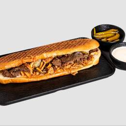 говяжий фарш, куриный фарш, багет, фри, фирменный соус