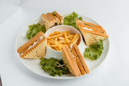 Нежное и сочное куриное филе, аккуратно приготовленное до золотистой корочки, расположено между четыремя слоями поджаренного хлеба. Свежие листья салата и ломтики спелого томата добавляют легкую хрустящесть и свежесть, а нежный соус подчеркивает вкус, не перебивая основные ингредиенты. Этот сэндвич — идеальный выбор для тех, кто ценит качество, удобство и насыщенный вкус.