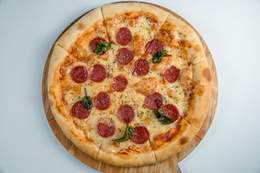 Пицца тесто, соус томатный, сыр микс, стручковый перец, колбаса салями, орегано