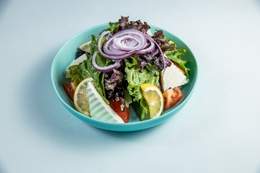 Помидоры, красный лук, микс салата, маслины, брынза сыр, лимон, заправка