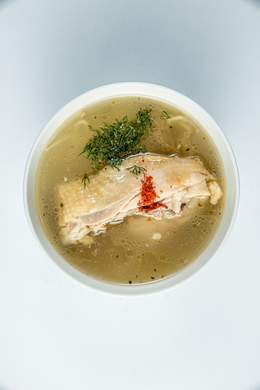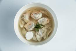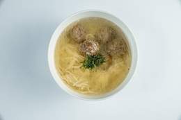 Фаршированные шарики, лапша, лук репчатый, бульон, зелень, специи
