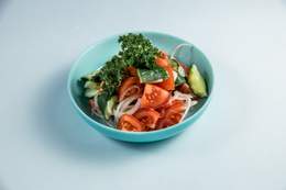 Помидоры, красный лук, стручковый перец, зелень, заправка
