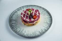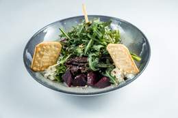 Свекла, сыр Креметто, руккола, микс салата, грецкий орех, крекер, медово-апельсиновая заправка