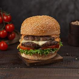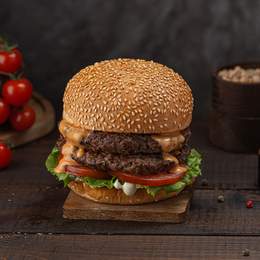 Двойная порция насыщенных говяжьих котлет, расплавленный сыр и ароматный соус создают уникальный вкус, заключенный в хрустящей булочке