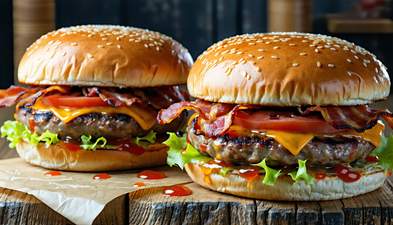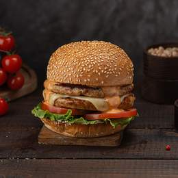 Сочетание куриной и говяжьей котлет с ароматным соусом и свежими овощами, заключенное в мягкую булочку для идеального вкусового баланса