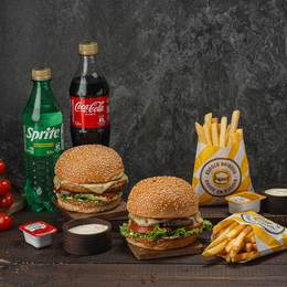 Куриный и говяжий чизбургеры, двойная порция хрустящего картофеля фри, два напитка и соус для настоящего удовольствия вдвоем