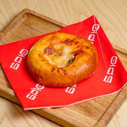 Как в школьной столовой — ароматная пышная булочка с румяной корочкой, щедро смазанная томатным соусом, с расплавленным сыром, соленым огурцом и кусочками сосиски из индейки.