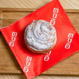 Мягкая булочка с начинкой из творожного сыра и сочной малины .