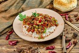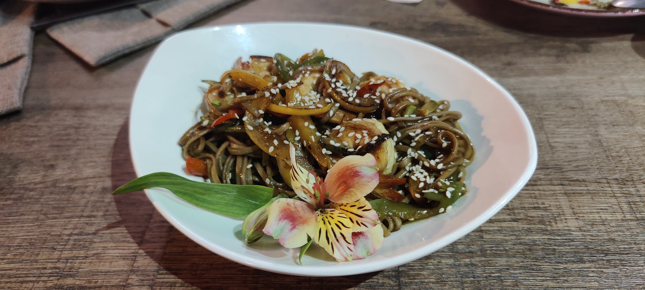 с говядиной, овощами, шпинатом, яйцом пашот, листьями нори