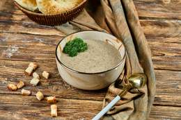 Кремовый суп с насыщенным грибным вкусом, приготовленный из отборных лесных грибов, идеально подходит для любителей нежных и ароматных блюд.
