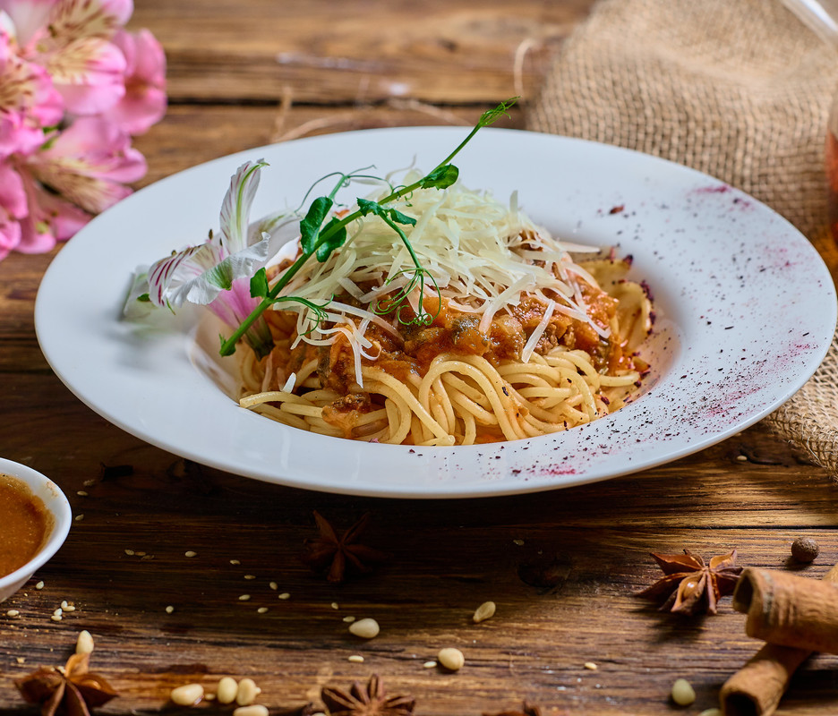 Классические спагетти с сочным мясным соусом Болоньезе, приготовленным по традиционному рецепту. Идеальное сочетание пасты и насыщенного вкуса.