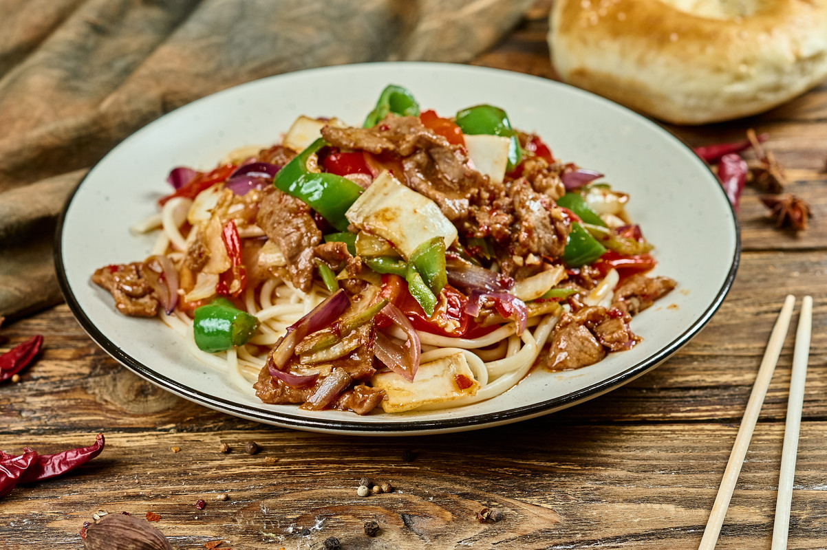 Обжареная телятина с помидорами, миксом салата, в имбирно-чесночном соусе