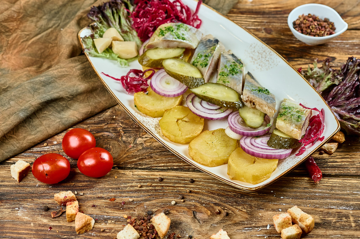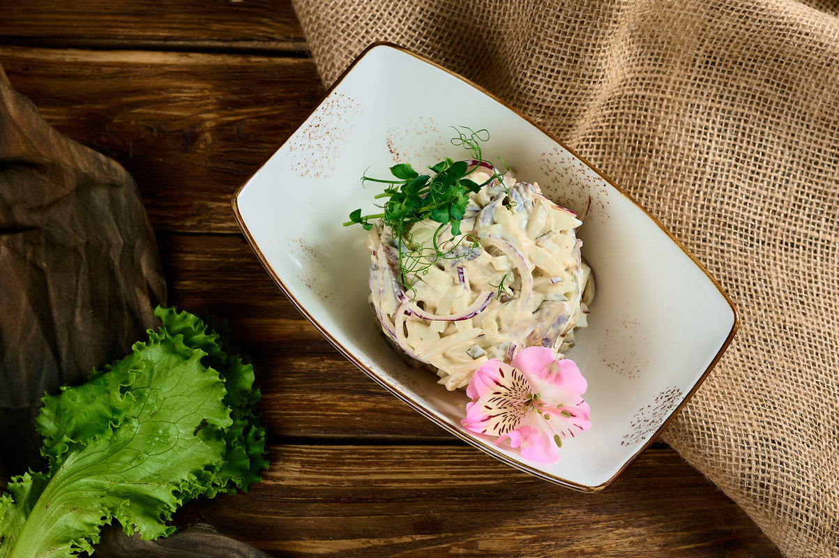Отварная говядина, соленые огурцы, отварные яйца, красный лук, заправлено под фирменным майонезом