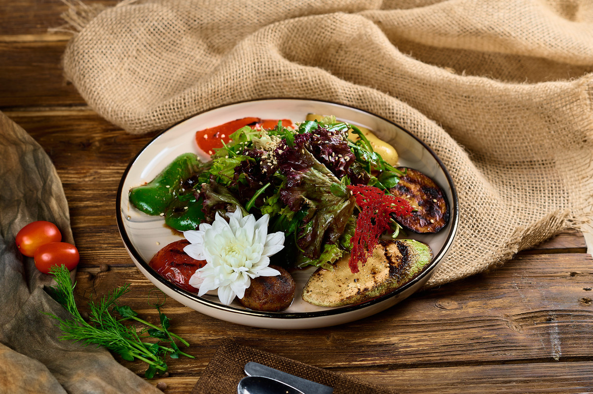 Микс салата под фирменным соусом, подается на обжаренных на гриле овощах