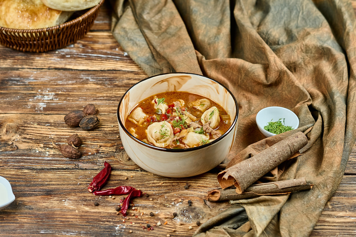 Сочные пельмени, сваренные в ароматном бульоне, создают гармоничное сочетание вкусов и текстур, идеально подходя для сытного обеда или ужина.