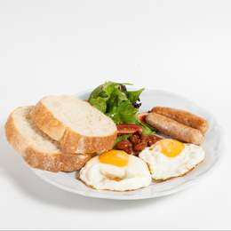 Обжаренные куриные колбаски, глазунья, свежий салат, фасоль в томатном соусе и два кусочка фирменного хлеба
