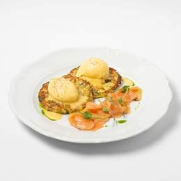 Нежные кабачковые оладьи с соусом морне, яйцами пашот и лососем слабой соли