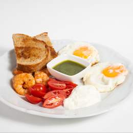 Глазунья из двух яиц, обжаренные креветки, помидоры черри, сыр страчателла, соус песто из щавеля и ремесленный хлеб