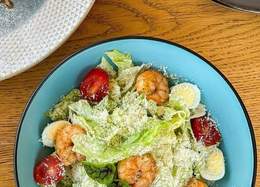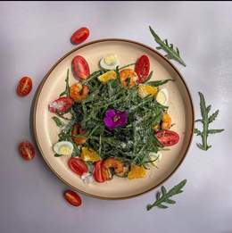 Салат из рукколы, креветок, сыра пармезан, апельсина.