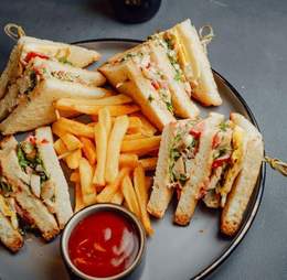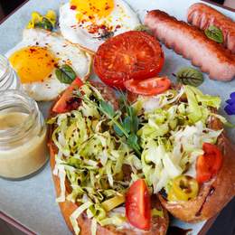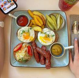 Обжаренные в сливочном масле чиабатты с сыром креметте, айсбергом, оливками и маслинами, говяжьи колбаски, помидор гриль, глазунья из 2 яиц, в подаче с горчичным и чесночным соусами.