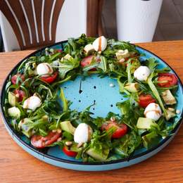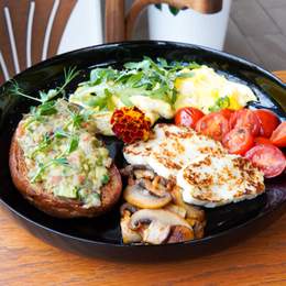 Скрэмбл из 2 яиц под рукколой и сыром пармезан , помидоры черри и шампиньоны, обжаренные в оливковом масле, томатная чиабатта с соусом гуакамоле.