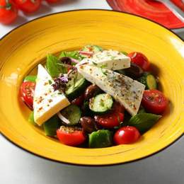 Салат из помидоров, сладкого перца, огурцов, феты, шалота и маслин, заправленный оливковым маслом с солью, чёрным перцем, душицей. Ключевым ингредиентом салата является фета - традиционный греческий сыр из овечьего молока.