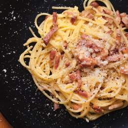 Спагетти с кусочками гуанчиале, смешанные с соусом из яиц, сыра пекорино романо, соли и чёрного перца.