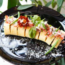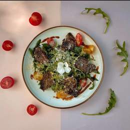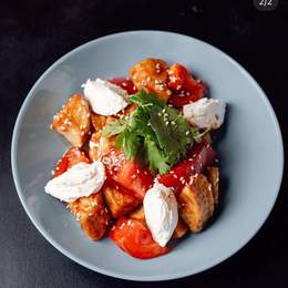 Обжаренные баклажаны в кукурузной панировке с помидорами гриль в кисло-сладком соусе, в подаче с сыром креметте, кинзой и кунжутными семечками.