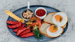 Глазунья из двух яиц, с домашними куриными сосисками. С добавлением фасоли, помидора, шампиньона и тостов