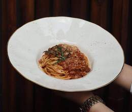 Обжаренный на оливковом масле фарш, с добавлением овощей, сельдерея и с добавлением томатного соуса и мускатного ореха, в подаче с перцем чили и сухариками.