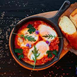 Традиционный завтрак, представляющий собой соус из томленых томатов, жареных перцев, лука, приправ и куриных яиц.