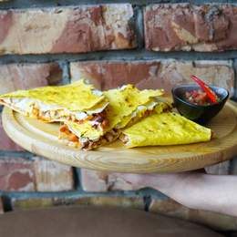 Кукурузная тортилья с начинкой из обжаренного куриного филе в соусе терияки с добавлением болгарского перца, репчатого лука, кукурузы, фасоли и сыра сулугуни, в подаче с соусом сальса и стручковым перцем.